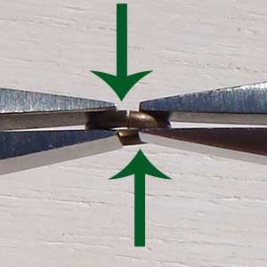 To close a jump ring, grasp each side of the ring near the cut with a pair of flatnose pliers. Holding the pliers firmly, move one hand toward your body and the other hand away so that the wire ends meet perfectly. Use the opposite motion to open a ring.